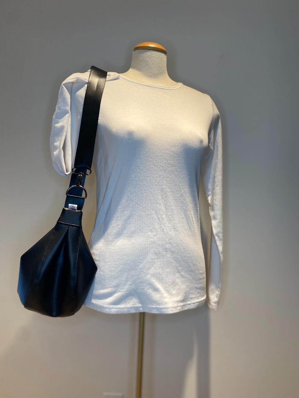 Nousha has an adjustable strap with a circumference (including the bag) of 43" - 64.5"
